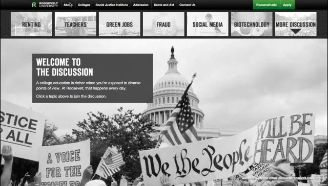 Roosevelt University is named in honor of FDR and Eleanor Roosevelt, one of America's greatest champions for social justice. The "Speak Your Mind" campaign raised hot-button topics and identified specific RU classes in which those topics would be discussed in an open, inclusive, academic environment. The campaign microsite enabled visitors to weigh in on the topics presented in the ads.